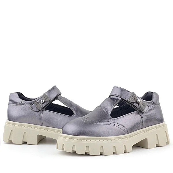 Rakerplus Hakiki Deri Platin Krem Tabanlı Cırtlı Kurdeleli Kız Çocuk Okul Ayakkabı