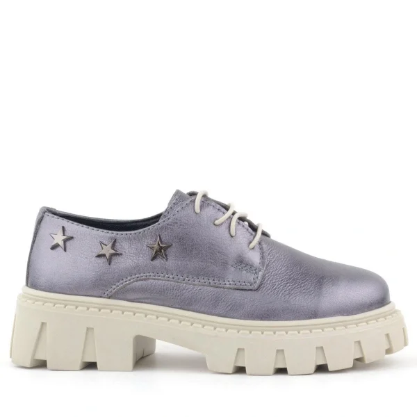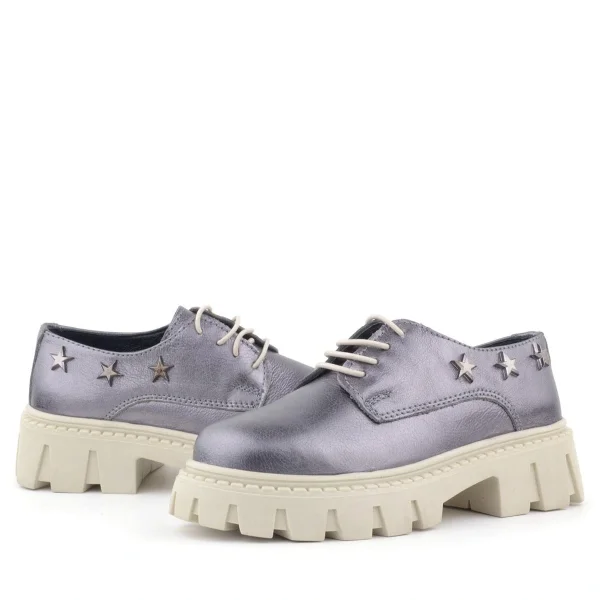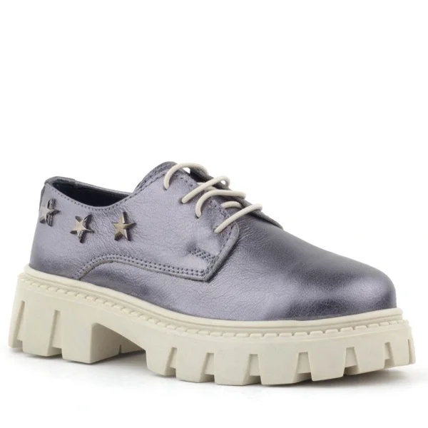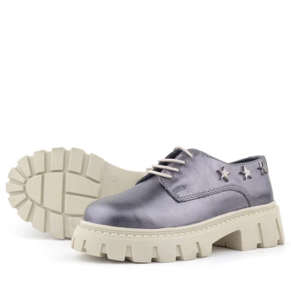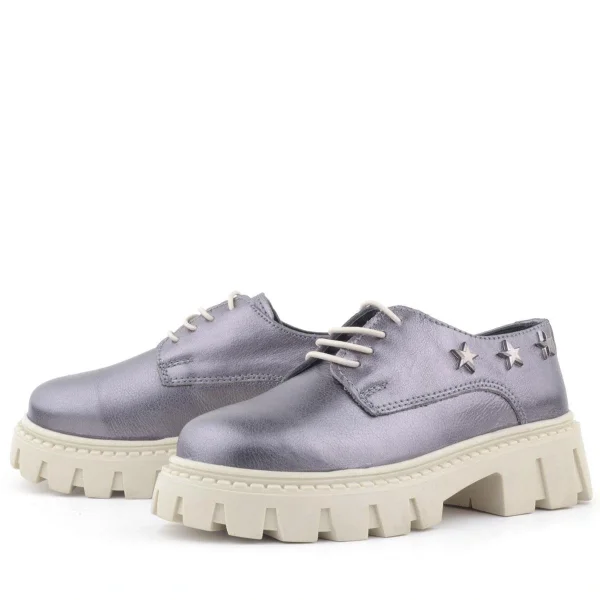 Rakerplus Platin Hakiki Deri Bağcıklı Yıldızlı Kız Çocuk Oxford Okul Ayakkabı