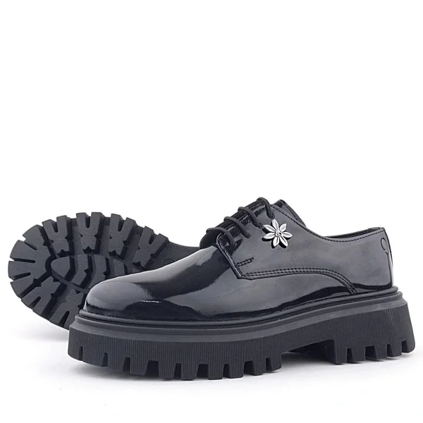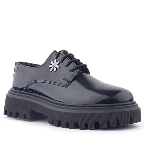 Rakerplus Siyah Rugan Bağcıklı Çiçek Detaylı Çocuk Klasik Ayakkabısı